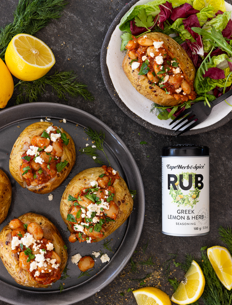 Add the butter beans and season the dish well with Cape Herb & Spice Greek Lemon & Herb Rub.