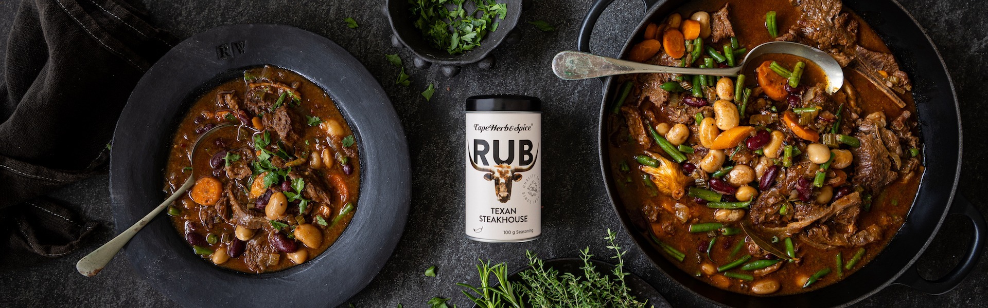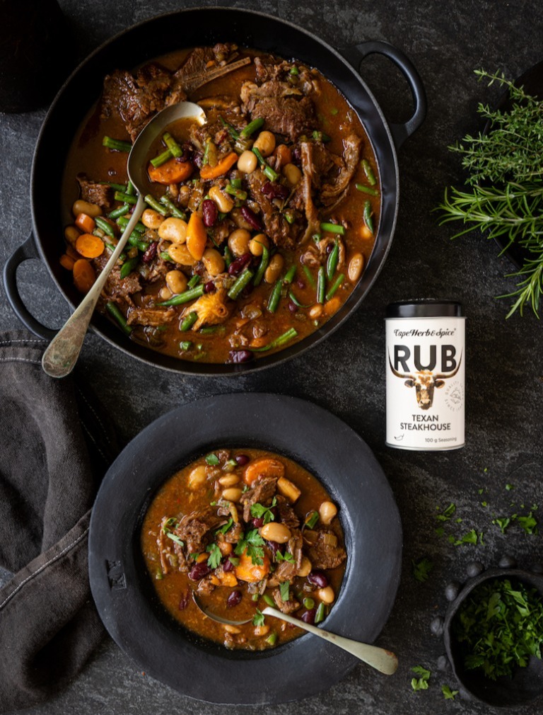 Preheat oven to 160˚C.Pat beef dry with paper towel. Place in a bowl and toss with flour.Heat a drizzle of olive oil in a large heavy-based pot over a medium heat. Add the meat to the hot oil and season well with Cape Herb & Spice Texan Steakhouse Seasoning.Sear in batches until golden brown all over. Remove and set aside. Heat another drizzle of oil in the same pot.Add the onion, carrots, celery, garlic and herbs. Season well with Cape Herb & Spice Texan Steakhouse Seasoning and sauté until fragrant. Add the tomato paste and balsamic and cook for a minute. Pour in the stock, making sure to scrape any stuck brown bits off the bottom of the pot. Return the browned beef to the pot.Bring to a simmer and cover with a lid.Transfer to the oven and cook for about 2 hours until the meat is fall off the bone tender.Check in on the meat and add the tinned beans with about 30 minutes to go. Remove from the oven and gently stir in the green beans.Simmer on the stovetop for 5-10 minutes to cook the green beans. Ladle into warm bowls and sprinkle with some fresh parsley. Serve and enjoy! Pressure cooker instructions:Follow all stovetop directions using the sauté function on your pressure cooker. When adding the stock and returning the seared meat, place the meat in the pressure cooker with the aromatics first and then pour over enough stock to just cover the meat.Seal the pressure cooker and set on high pressure for 45 minutes.Allow for a 10 minute natural release and then quick release the pressure. Return the pressure cooker to sauté mode and add the tinned beans and simmer.Finally add the green beans just before serving.