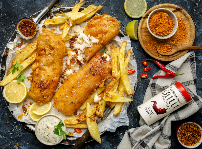 Crispy, spicy and full of flavour! Our Chilli Crunch Seasoning adds epic crunch and a fiery kick to this fried Cape Whiting, turning classic fish & chips into something unforgettable.