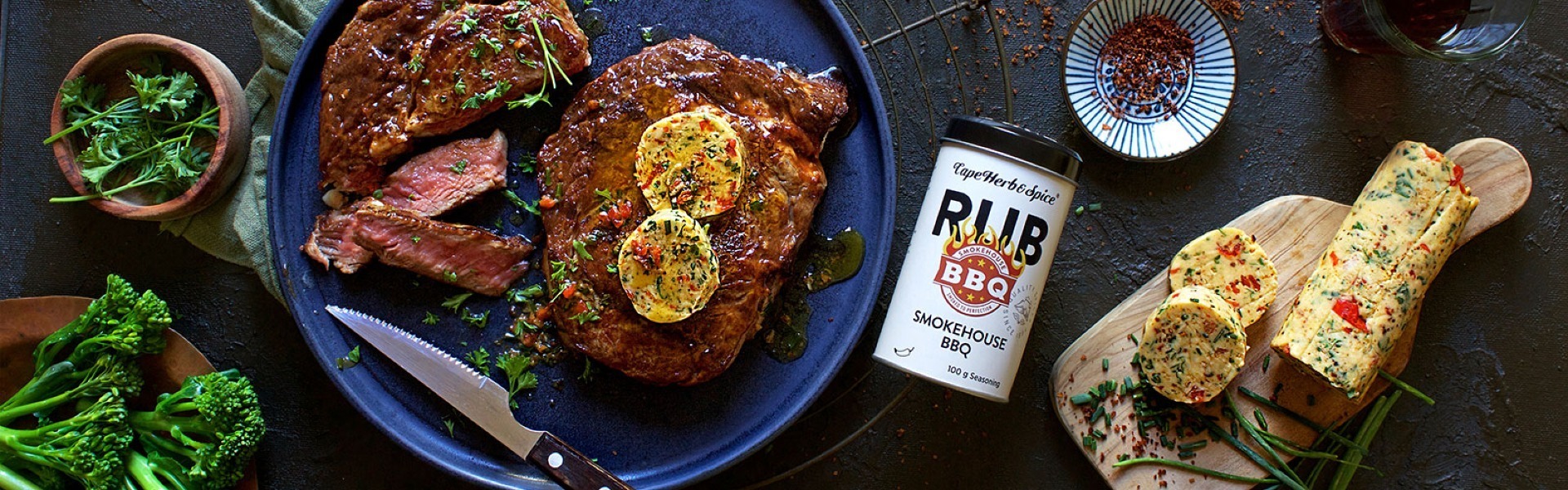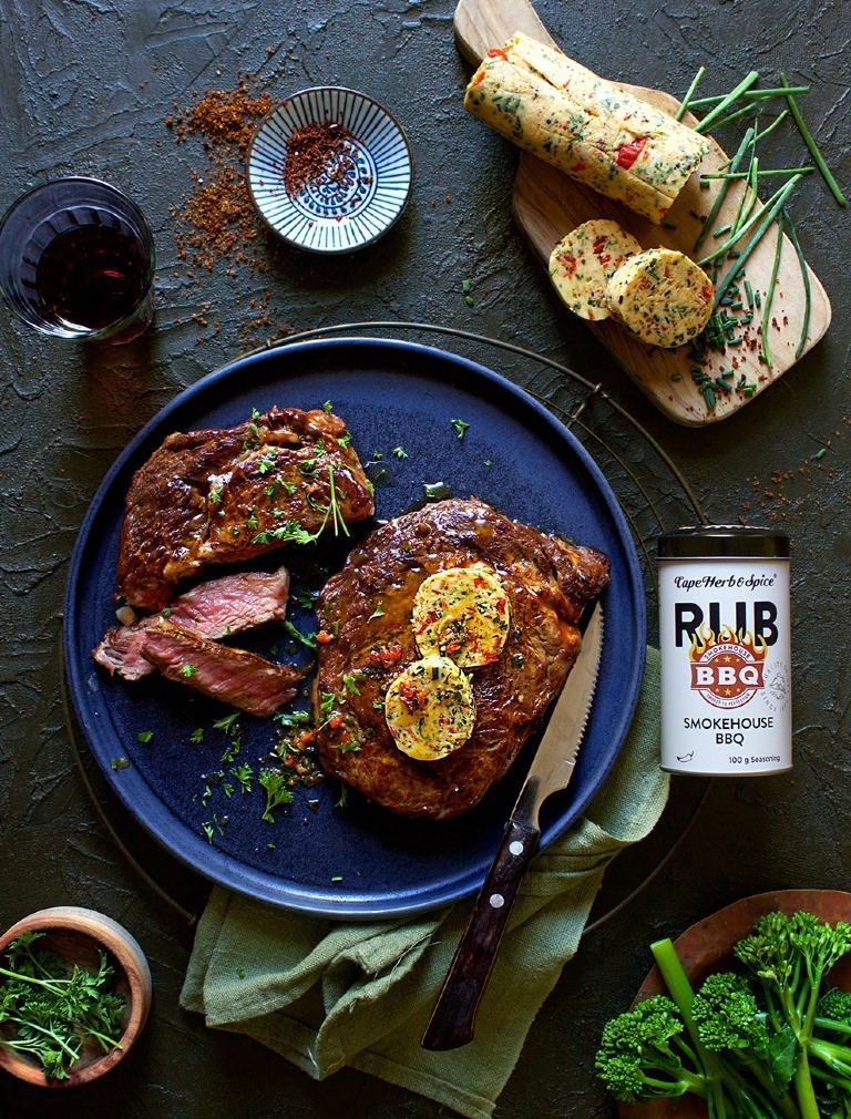 Beef steak is a treat any day of the week, but you can elevate it from good to sublime in a flash. How? By topping your steak with a cheeky BBQ compound butter! This butter is packed with smokey flavour care of our versatile Cape Herb & Spice Smokehouse BBQ Rub, plus garlicky aromatics and herbal freshness. It’s so easy to make and will keep in the fridge for a good ten days, or for a few months in your freezer.