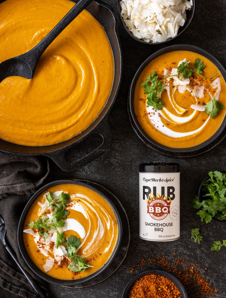 Flip so that all the sweet potato halves are lying cut side down on the baking tray.Transfer to the oven and roast for ± 30 minutes, depending on their size, until extremely soft and well caramelised.While the sweet potatoes are roasting, heat a drizzle of olive oil in a large pot and cook the onion until tender.Season with Cape Herb & Spice Smokehouse BBQ Seasoning.Remove sweet potatoes from the oven and allow to cool slightly so that you can handle them. Peel away the skins / scoop out the flesh. Add the sweet potato flesh to the pot.Pour in the coconut cream, stock and apple juice. Bring to a simmer. Switch off the heat and using an immersion blender, blend until smooth. Taste to adjust seasoning. Ladle soup into warm bowls and finish with fresh coriander, toasted coconut flakes and a drizzle of coconut cream or yoghurt. Serving tip:For a little flourish - keep a dash of coconut cream aside for drizzling over the dished up soup bowls before serving. You can also use yoghurt or sour cream.