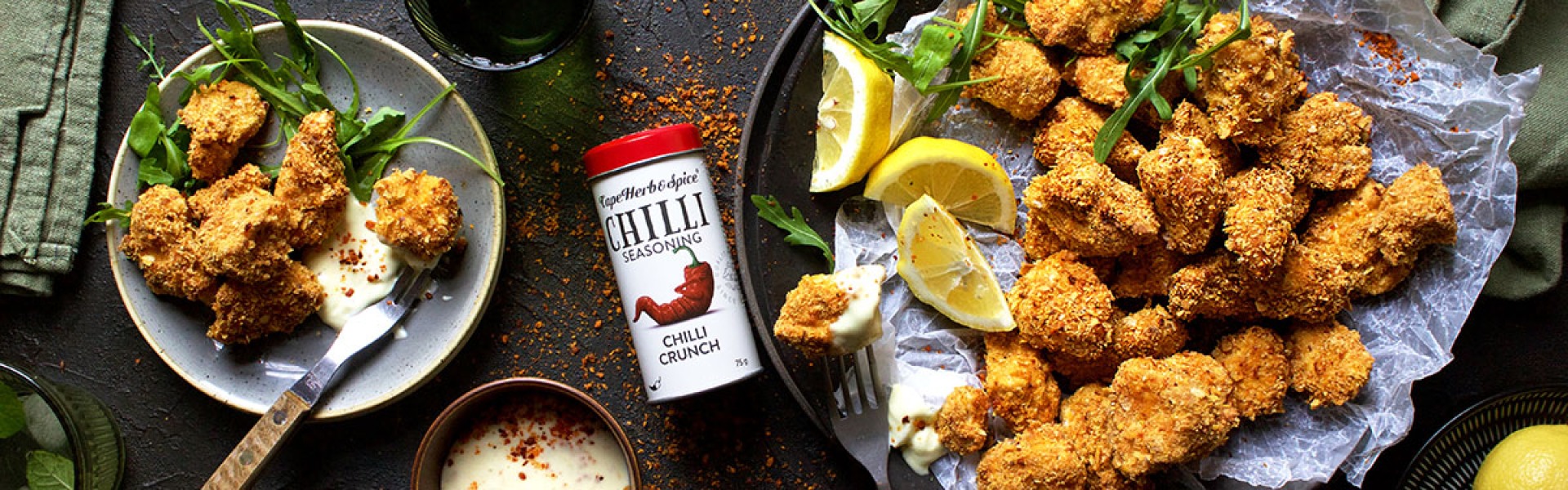 Add 1 Tsp salt and 1 Tsp Cape Herb & Spice Chilli Crunch spice to the flour and stir to combine. Add 2 Tbsps Cape Herb & Spice Chilli Crunch spice to the cornflake crumbs and stir to combine. Dip the blocks of chicken into the flour and shake off the excess. Next dip them in the whisked egg and shake off the excess. Finally dip them in the crumb mix and toss to ensure they are thoroughly coated.