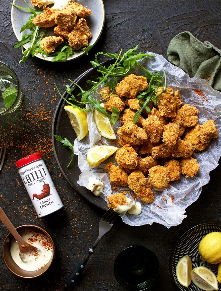 These chicken nuggets are seriously moreish little bites. Straight out of the air fryer they are piping hot and incredibly juicy. But they’re also great served at room temperature, especially when dipped into our cheeky Chilli Crunch lemon mayo.