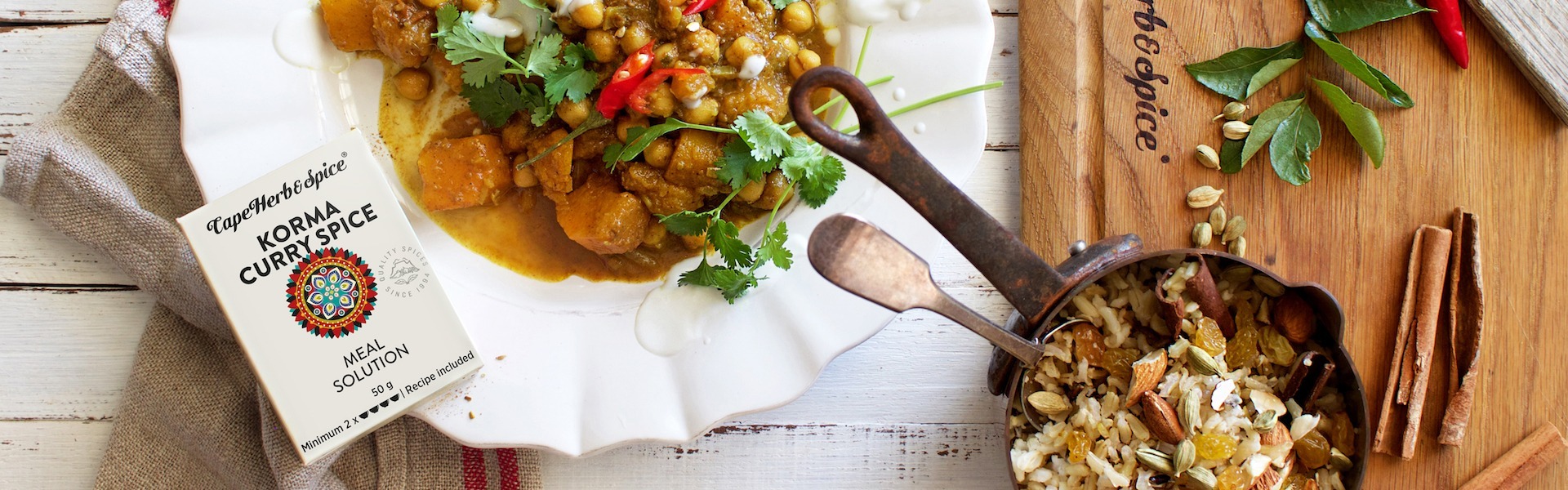 To make the korma: Fry the onions over medium heat in vegetable oil until soft. Add the ginger and garlic and fry for a further minute. Add the Cape Herb & Spice Korma Spice and fry for a further minute. Add the coconut milk, tomato, salt, chilli, water and butternut. Cover with a lid and simmer over low heat until the butternut is soft, then add the chickpeas and warm through.