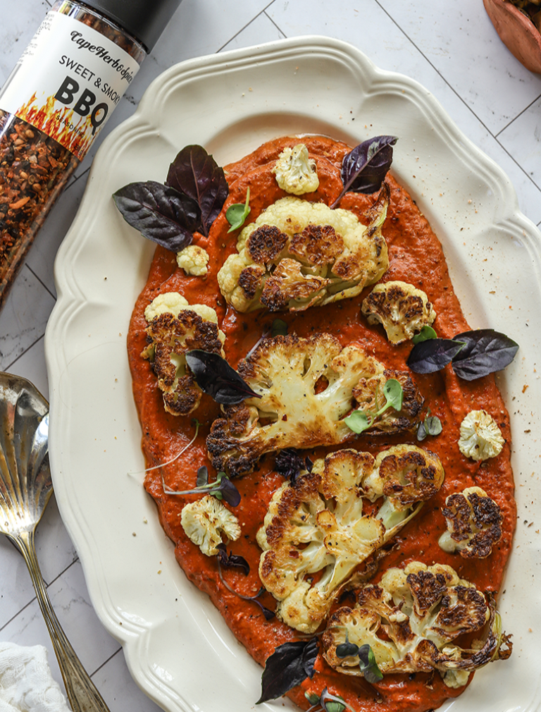 1. Preheat the oven to 180 degrees Celsius.2. Slice the cauliflower into slices, place on a parchment paper-lined tray, drizzle with olive oil,and the BBQ seasoning. Bake for 20-25 minutes until golden.3. Add the cooked red pepper, along with the rest of the dip ingredients, and blend until supersmooth.4. Once the steaks are cooked, add the dip to a serving platter, then top with the roastedcauliflower steaks, fresh herbs, and another dash of BBQ seasoning.5. Serve and enjoy!