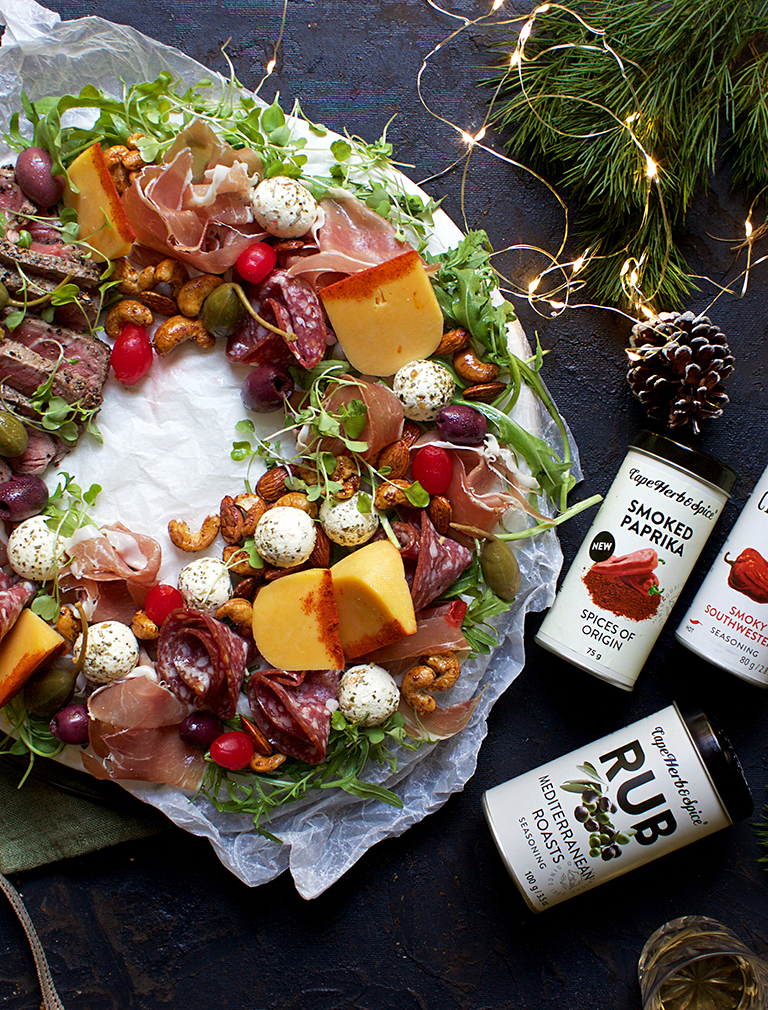 Wow your guests this festive season this fabulously luxurious charcuterie and cheese wreath. We take ordinary Gouda to new heights of smoky deliciousness with our Cape Herb & Spice Smoked Paprika. Cream cheese is transformed into a herby delight thanks to our Mediterranean Roasts Rub. We also made spiced nuts for this indulgent wreath using our popular Chipotle Chilli spice. And still that’s not enough because in addition to shop-bought charcuterie, we add a zingy pepper-crusted carpaccio that is just so easy to make!