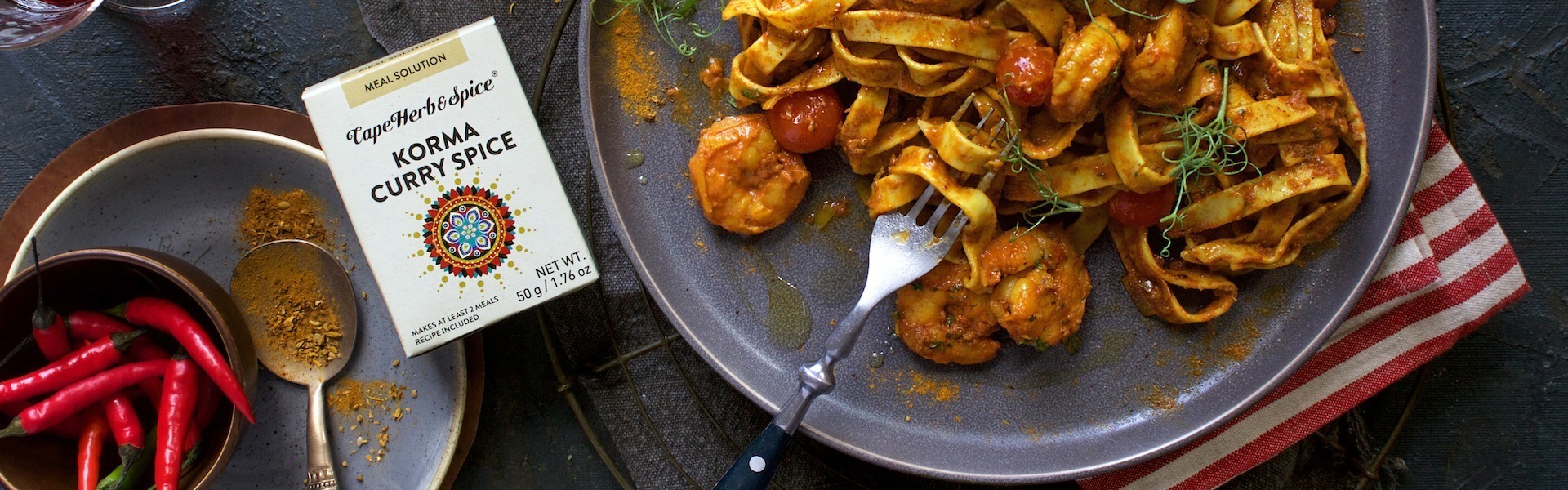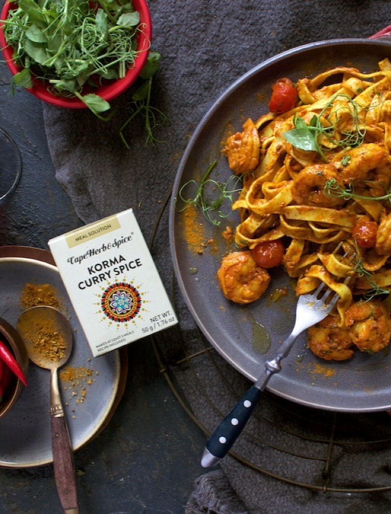 Add the butter and oil to a large saucepan. Add the leeks and fry over low heat until they’re soft and buttery. Add the garlic and fry for a further minute. Add the tomato paste and Cape Herb and Spice Korma Curry Spice, the sugar, salt and the tinned tomatoes. Place lid on and cook sauce over medium heat for fifteen minutes. Then add the defrosted prawns and cook for a few minutes until they are just cooked through. Stir in the cream and heat for a few seconds to ensure pasta sauce is hot. Toss with tagliatelle pasta and garnish with chopped parsley and coriander to serve.