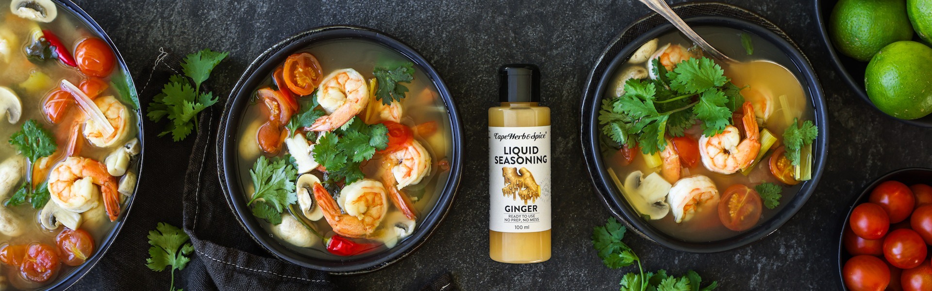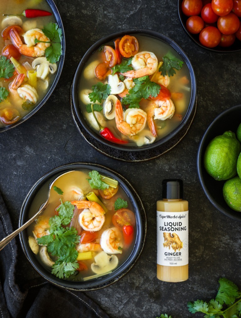 Place chicken stock in a large pot and heat.Bash the lemongrass stalks with a rolling pin to break them open slightly and then cut into large chunks.(You will not eat the lemongrass so keep the chunks large so they are easy to avoid.)Add the lemongrass, shallots, chillies, lime zest, fish sauce and sugar to the pot. Cover with a lid and simmer for 10 minutes for the flavours to infuse. Add the cherry tomatoes, mushrooms and prawns. Cook for 2-3 minutes depending on the size of your prawns. Sprinkle in the fresh coriander leaves and then squeeze in the Cape Herb & Spice Liquid Seasoning Ginger. Taste to adjust seasoning. Finish the soup with the fresh lime juice just before serving.Ladle into warm bowls right away and enjoy!