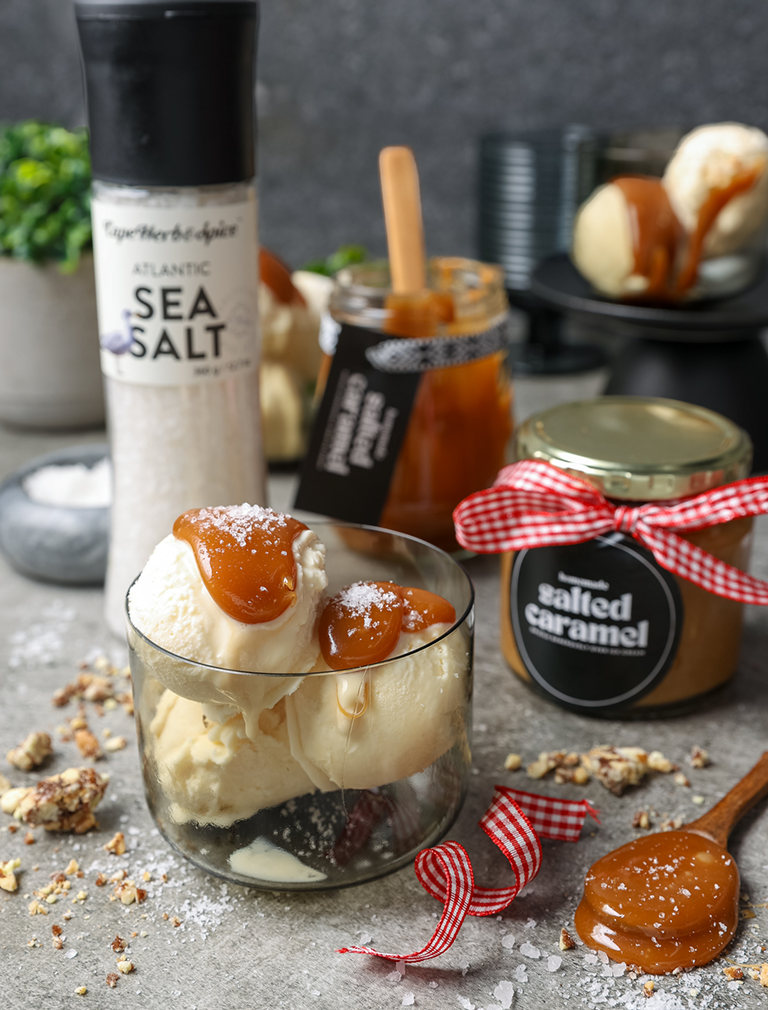Add the sugar and water to a saucepan. Cook over medium heat until the sugar dissolves and begins to caramelise. Avoid stirring; instead, swirl the pan occasionally. Brush the sides of the pan with a pastry brush dipped in warm water to prevent crystallisation.When the sugar turns a light amber colour*, remove from the heat and carefully whisk in the butter, vanilla, and cream. Stir until the bubbling subsides, then add the Cape Herb & Spice Atlantic Sea Salt and mix until smooth.Allow to cool completely before bottling in a clean, sterilised jar. Top the cooled caramel with an extra sprinkling of Cape Herb & Spice Atlantic Sea Salt just before sealing.*The window between perfectly golden and too dark is brief, so watch closely. Once the sugar deepens in colour, immediately remove it from the heat to avoid a burnt fl avour.Tip: If the caramel thickens too much, stir in a little more cream.