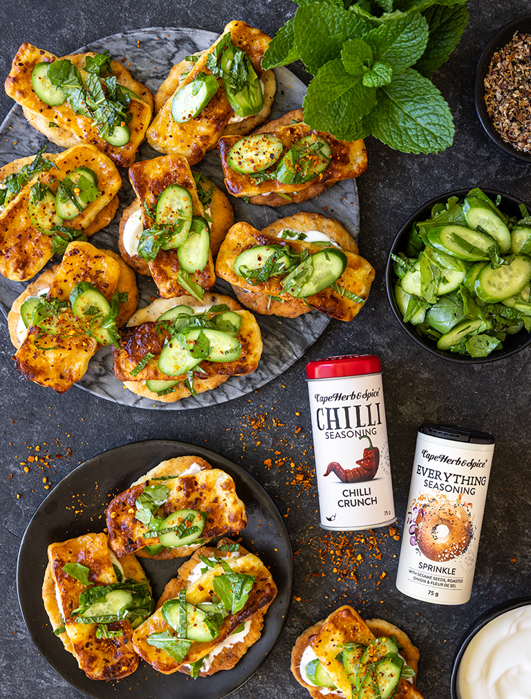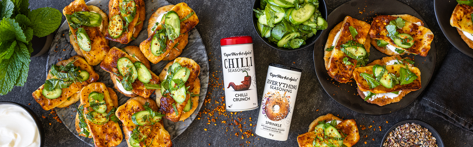 Drizzle halloumi with honey and then sprinkle with Cape Herb & Spice Chilli Crunch.