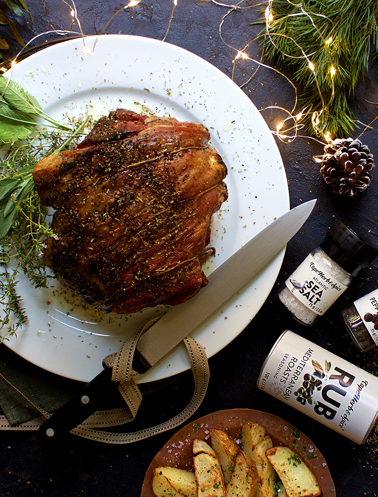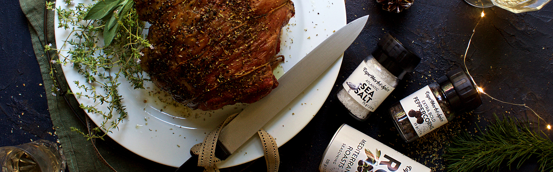 To make the leg of lamb: If the leg of lamb has been tied up with string, undo it. Very generously sprinkle the meat with our Cape Herb & Spice Mediterranean Roast Rub, then use plain string to tie the leg up again. Use a sharp, thin knife to stab tiny pockets in the lamb. Insert slivers of garlic and bits of anchovy (if using) into these cuts. Paint the lamb with olive oil and generously sprinkle the fatty outside of the leg with our rub as well.