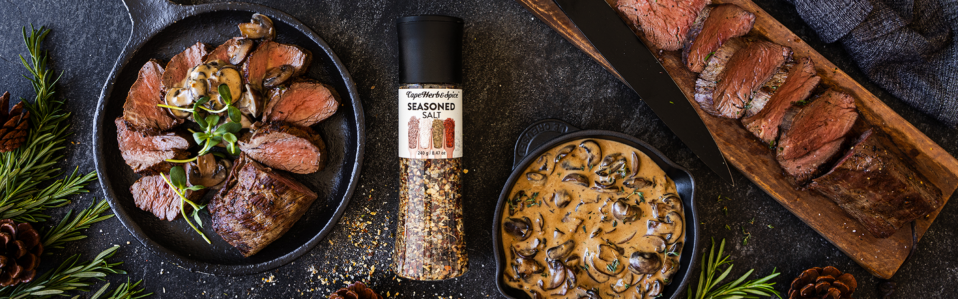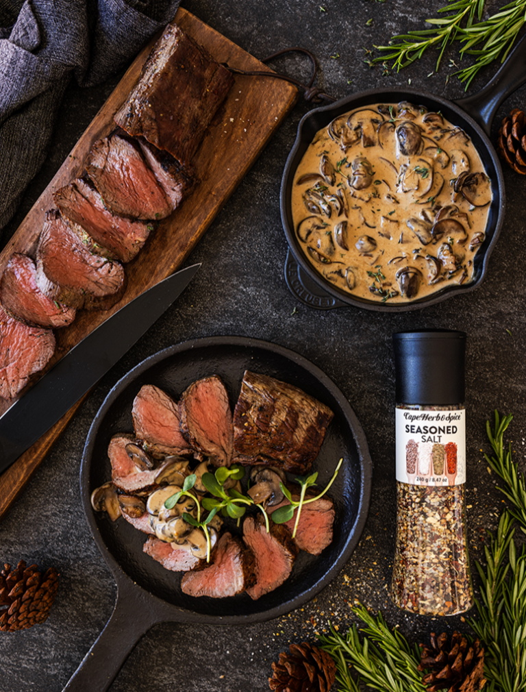 Rub fillet with olive oil and season thoroughly with Cape Herb & Spice Seasoned Salt Grinder.