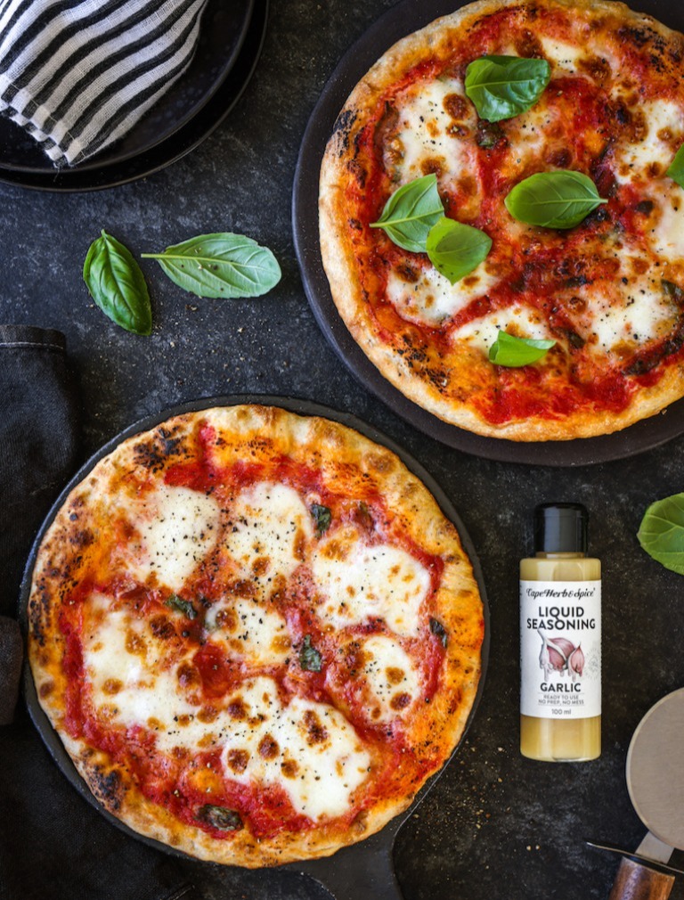 Organization tips: Make the dough the morning you’d like to have a pizza evening. About 30 minutes before you make your pizzas - tear the mozzarella into chunks and then place on a plate in the fridge lined with a clean dish cloth or a few layers of paper towel to drain away excess moisture.For the sauce:Blend the tinned tomatoes with an immersion / stick blender in a bowl. To that add the olive oil, Cape Herb & Spice Sea Salt, torn up basil and Cape Herb & Spice Liquid Seasonings Garlic.