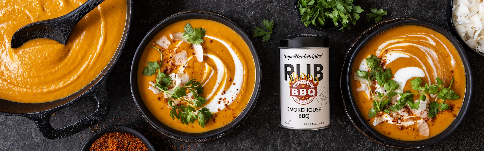 Flip so that all the sweet potato halves are lying cut side down on the baking tray.Transfer to the oven and roast for ± 30 minutes, depending on their size, until extremely soft and well caramelized.While the sweet potatoes are roasting, heat a drizzle of olive oil in a large pot and cook the onion until tender.Season with Cape Herb & Spice Smokehouse BBQ Seasoning.Remove sweet potatoes from the oven and allow to cool slightly so that you can handle them. Peel away the skins / scoop out the flesh. Add the sweet potato flesh to the pot.Pour in the coconut cream, stock and apple juice. Bring to a simmer. Switch off the heat and using an immersion blender, blend until smooth. Taste to adjust seasoning. Ladle soup into warm bowls and finish with fresh coriander, toasted coconut flakes and a drizzle of coconut cream or yoghurt. Serving tip:For a little flourish - keep a dash of coconut cream aside for drizzling over the dished up soup bowls before serving. You can also use yoghurt or sour cream.
