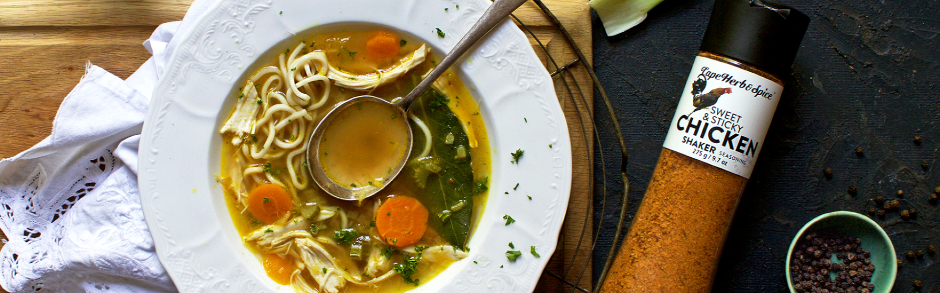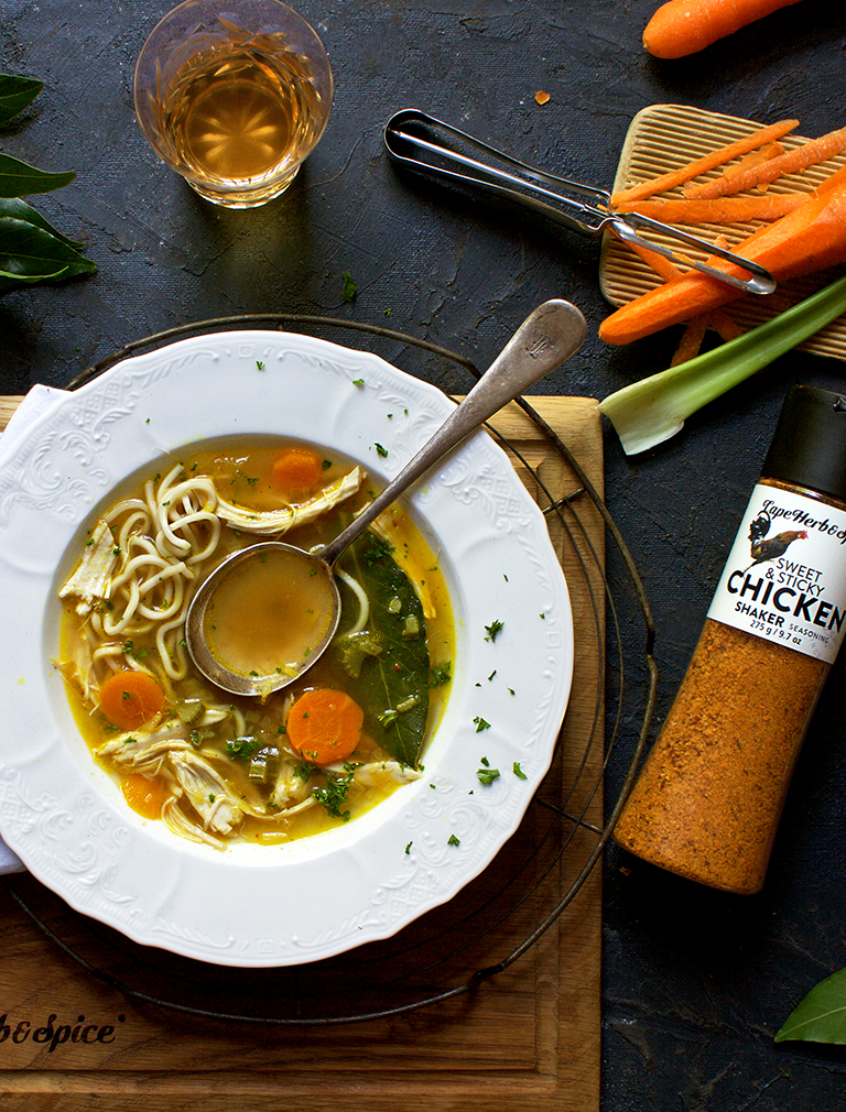 Fry the onion, carrot and celery in the vegetable oil and butter until soft. Add the garlic and fry for a further minute or two. Add the water, the peppercorns, the Cape Herb & Spice Sweet & Sticky Chicken Shaker spice along with the bay leaf and cloves. Turn the heat down low, place a lid on and simmer for five minutes – this is just to give the aromatics time to develop their flavour. Then add the chicken and the noodles and boil until the noodles are cooked through.