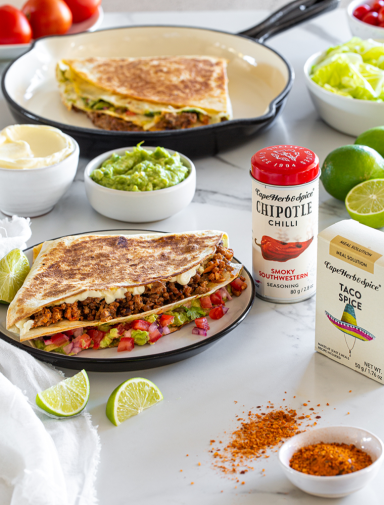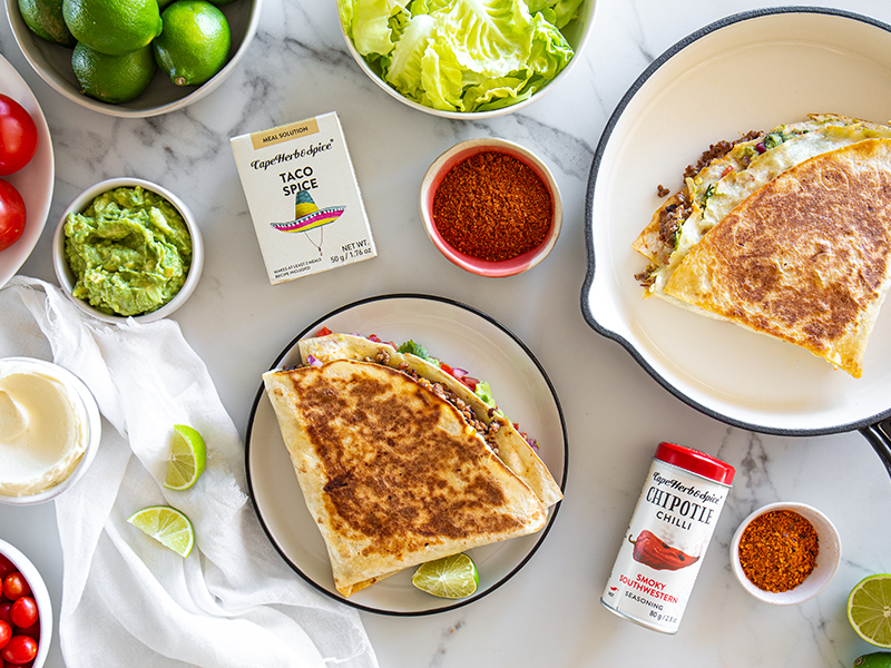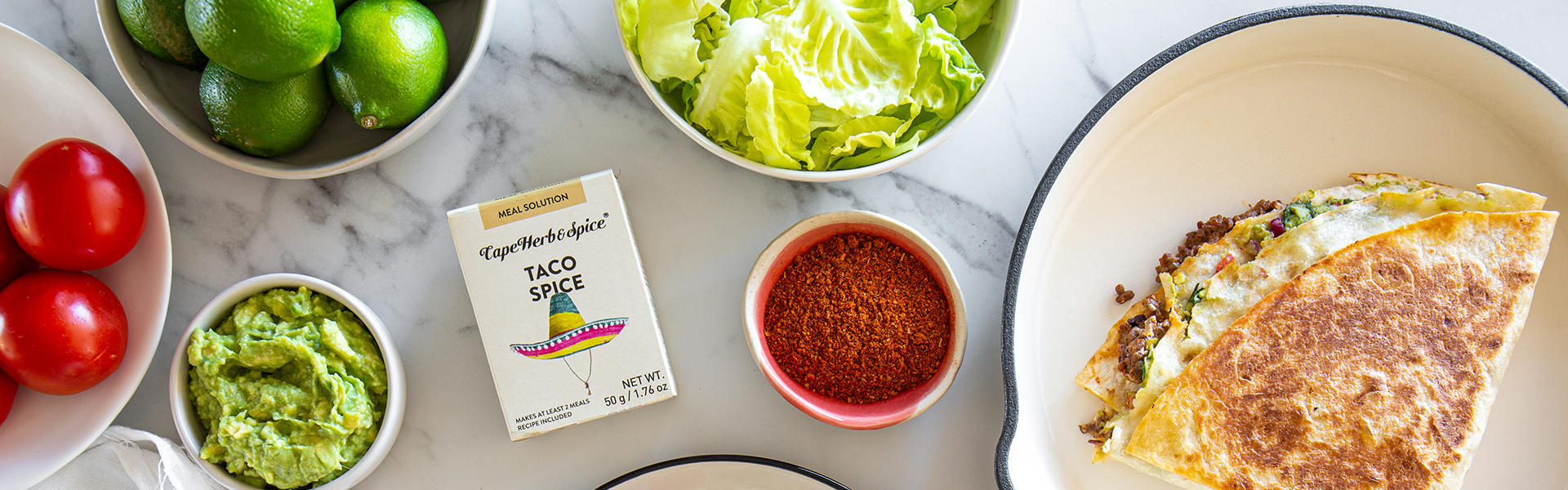 Lightly brown the onion in a drizzle of olive oil. When soft add the Cape Herb & Spice Taco Spice and fry until fragrant. Add the tomato paste and beef mince. Cook until mince is cooked through and the tomato flavour caramelised. Set aside.